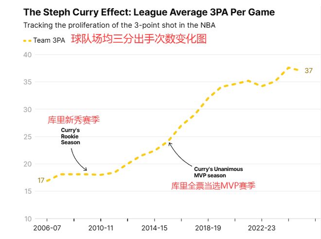 现在联盟球队场均三分出手数,是库里新秀赛季的两倍还多。在“库里式篮球”的影响下,新一代球员不断拓展射程,比以往任何时代都更刻苦打磨跳投。就连7尺长人如今也都在投三分。